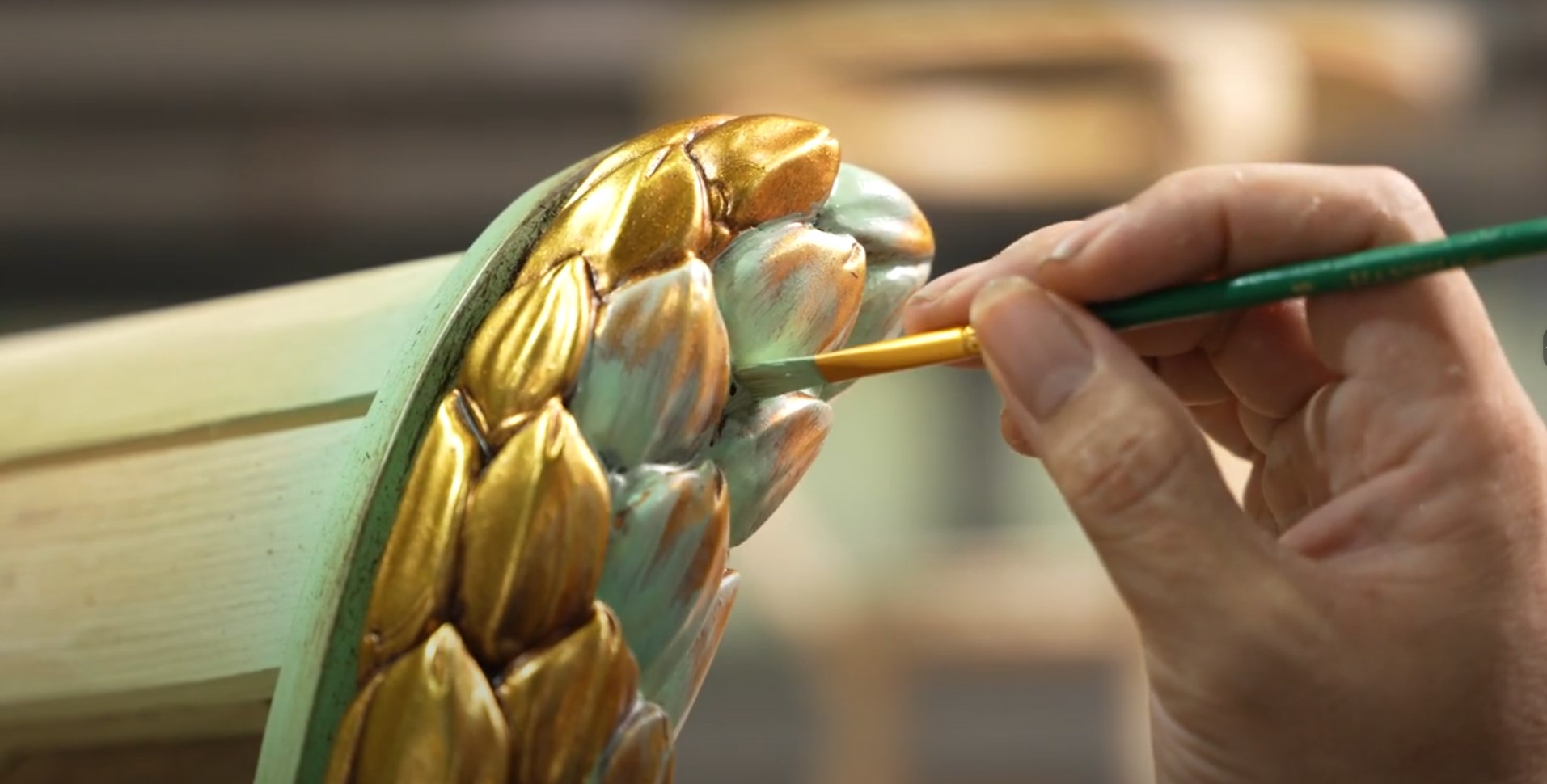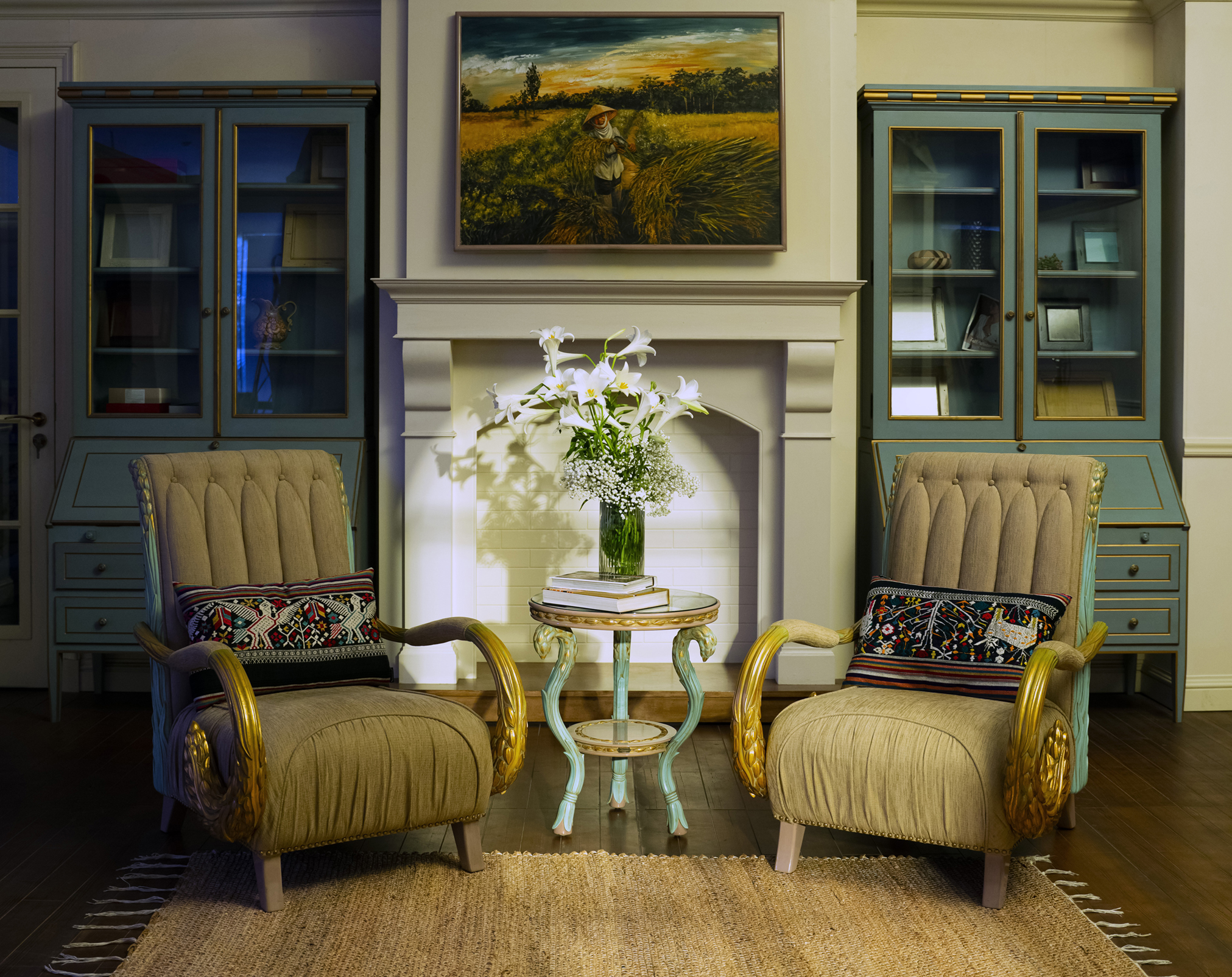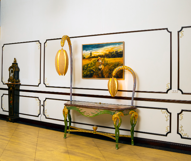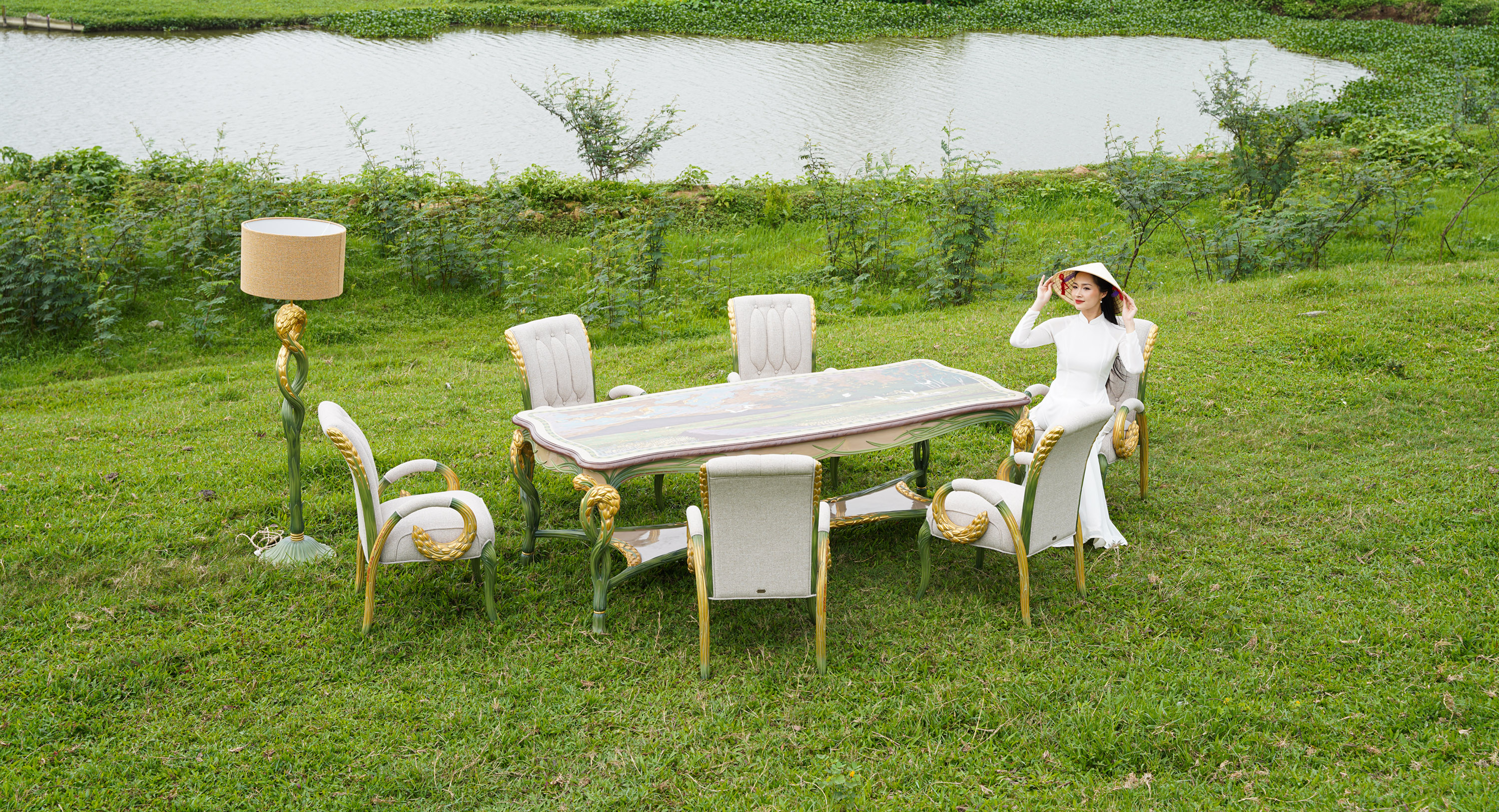 Ấn tượng và sáng tạo trong bộ sưu tập là hình ảnh cách điệu từ bông lúa non được chạm khắc tỉ mỉ, dát vàng điểm xuyết màu sơn đặc biệt - màu của đồng nội nhẹ nhàng quyến rũ. Ngôn ngữ thiết kế này tiếp tục được "phá cách " trong các sản phẩm nội thất khác,